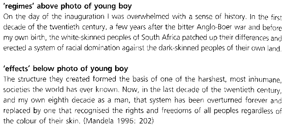 The left-right axis of the page, the vectors in the inauguration-flag image, and its relations with preceding text, combine to construct an indexical temporal sequence. The gaze of people in the crowd is up to the stage and across to the left. Implicit in these gazes is the inauguration ceremony they are watching, and its central protagonist, Mandela. And their gaze is also towards Mandela’s life story that lies to the left of the image. These vectors realise implicit identification, all pointing anaphorically to ‘him’, Mandela. But Mandela himself is not in the picture. Counterbalancing this up and leftward gaze is the powerful vector in the flag, which points down and right towards the people who surround it, cataphorically identifying ‘them’. In sum, the layout and images indexically construe a complex activity sequence, in which not only apartheid belongs to the past, but also the struggle against it, and Mandela’s own life story. In contrast the future belongs to the people.